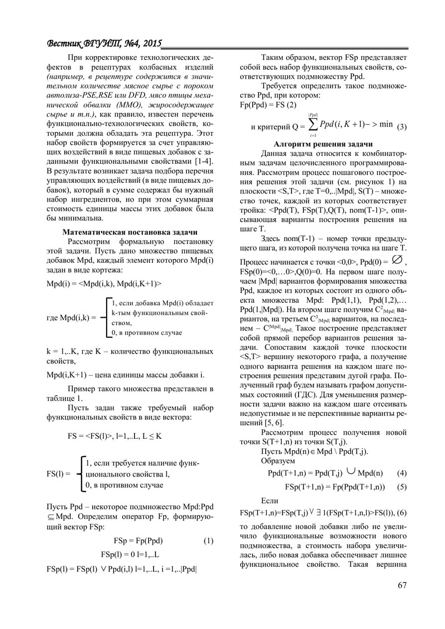 В статье рассматривается задача оптимизации управляющих воздействий в виде пищевых добавок в рецептурах колбасных изделий для устранения дефектов в мясном сырье при управлении производством. Предложена математическая постановка задачи и алгоритм ее решения. Формально задача классифицируется как комбинаторная задача целочисленного линейного программирования, целью которой является обеспечение набора функционально-технологических и вкусо-ароматических свойств конечного продукта при минимальной стоимости единицы массы пищевых добавок. Предложенный алгоритм решения реализует метод пошагового построения решения с отсевом неперспективных вариантов, определяемых на основе рекуррентных соотношений. Рассмотрен пример определения набора оптимальных пищевых добавок для конкретного производственного случая, когда в рецептуре вареной колбасы «Столичная» содержится большое количество жиросодержащего сырья. Для решения проблемы связывания и эмульгирования жирного сырья, как показано в статье, необходимы пищевые добавки, которые в комплексе содержали бы: фосфат (регулятор кислотности, водоудерживающий агент), антиоксидант, эмульгатор, загуститель, гелеобразователь, животный белок (наполнитель), краситель, фиксатор окраски, усилитель вкуса и аромата. Для примера был представлен набор из шести разных пищевых добавок с указанием их функционально- технологических и вкусоароматических свойств, а также стоимости. Необходимо было определить, какие из этих пищевых добавок включить в рецептуру, чтобы с одной стороны они, в конечном счете, содержали заданный набор указанных свойств, а с другой - их суммарная стоимость была минимальна. Решая данную задачу с применением рассмотренного алгоритма, нашли оптимальный набор пищевых добавок, которые полностью покрывают множество. Этот набор содержит все необходимые ингредиенты для решения поставленной задачи, при этом их суммарная стоимость является минимальной, в отличие от других возможных комбинаций. Рассмотренный алгоритм реализован в программной системе “МультиМит Эксперт” в системе поддержки принятия решений.