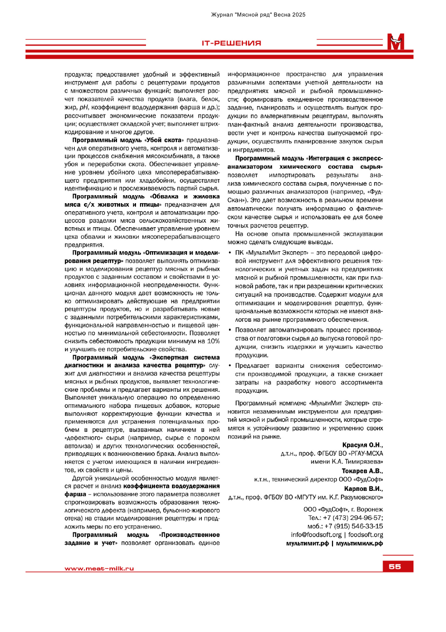 Авторы: Красуля О.Н., д-р техн. наук, проф., ФГБОУ ВО «РГАУ-МСХА имени К.А. Тимирязева»; Токарев А.В., канд. техн. наук, техн. директор ООО «ФудСофт»; Карпов В.И., д.т.н., проф. ФГБОУ ВО «МГУТУ им. К.Г. Разумовского»