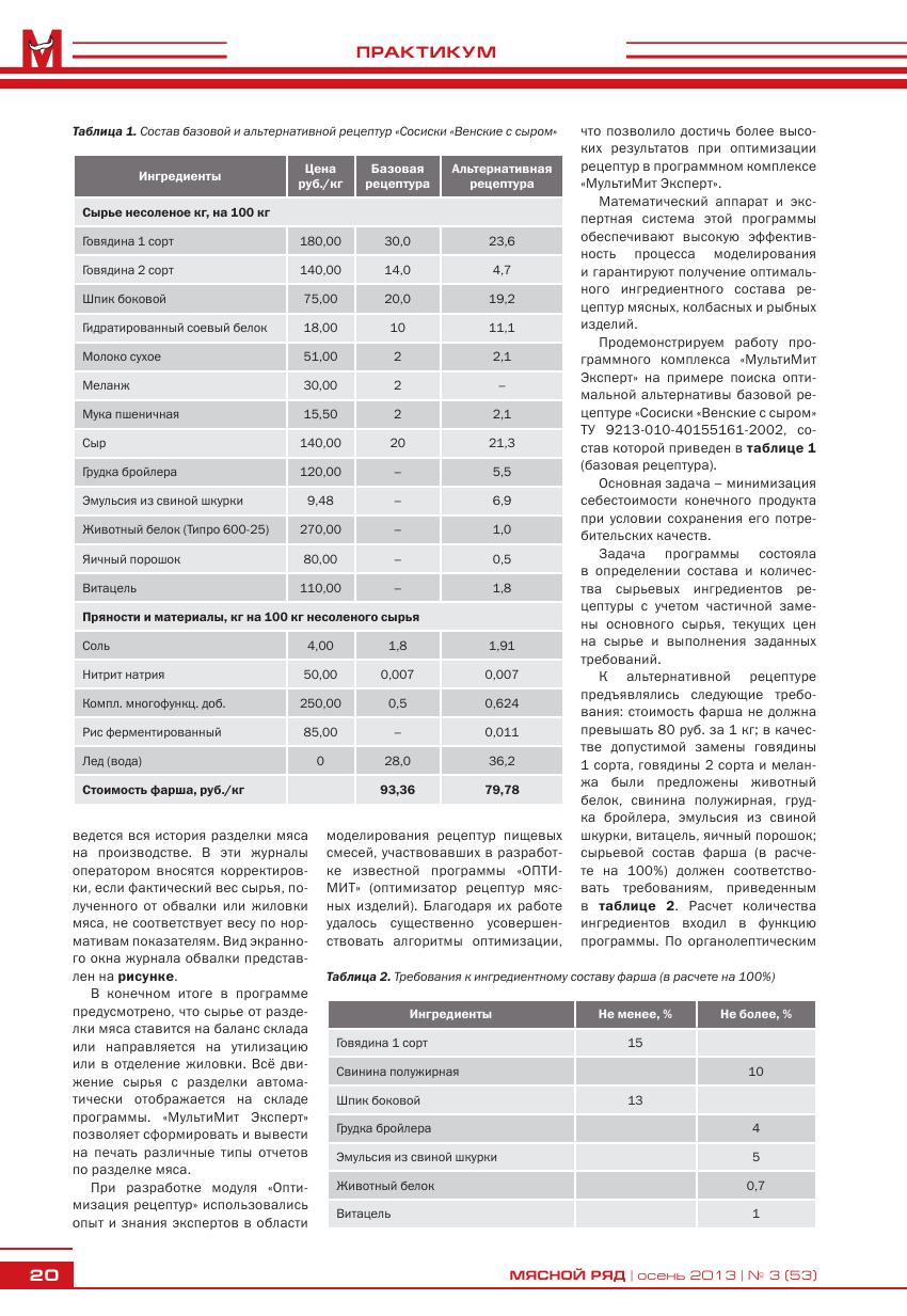 Ключевые слова: программный комплекс "МультиМит Эксперт", моделирование и оптимизация рецептур, экспертная система, управление качеством продукта, обвалка, жиловка, минимизация себестоимости продукта, управление качеством, атоматизация, учет.